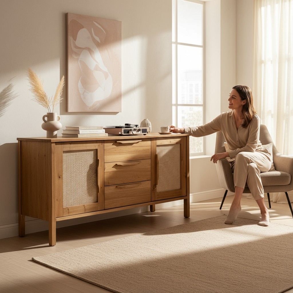 Un mueble para todos los usos. Impecable como Bahiut Vajillero en tu living comedor. Su diseño con 3 cajones y 2 puertas con bisagras cazoletas, marco de madera maciza de álamo y entelado con ráfia natura calada con apresto.