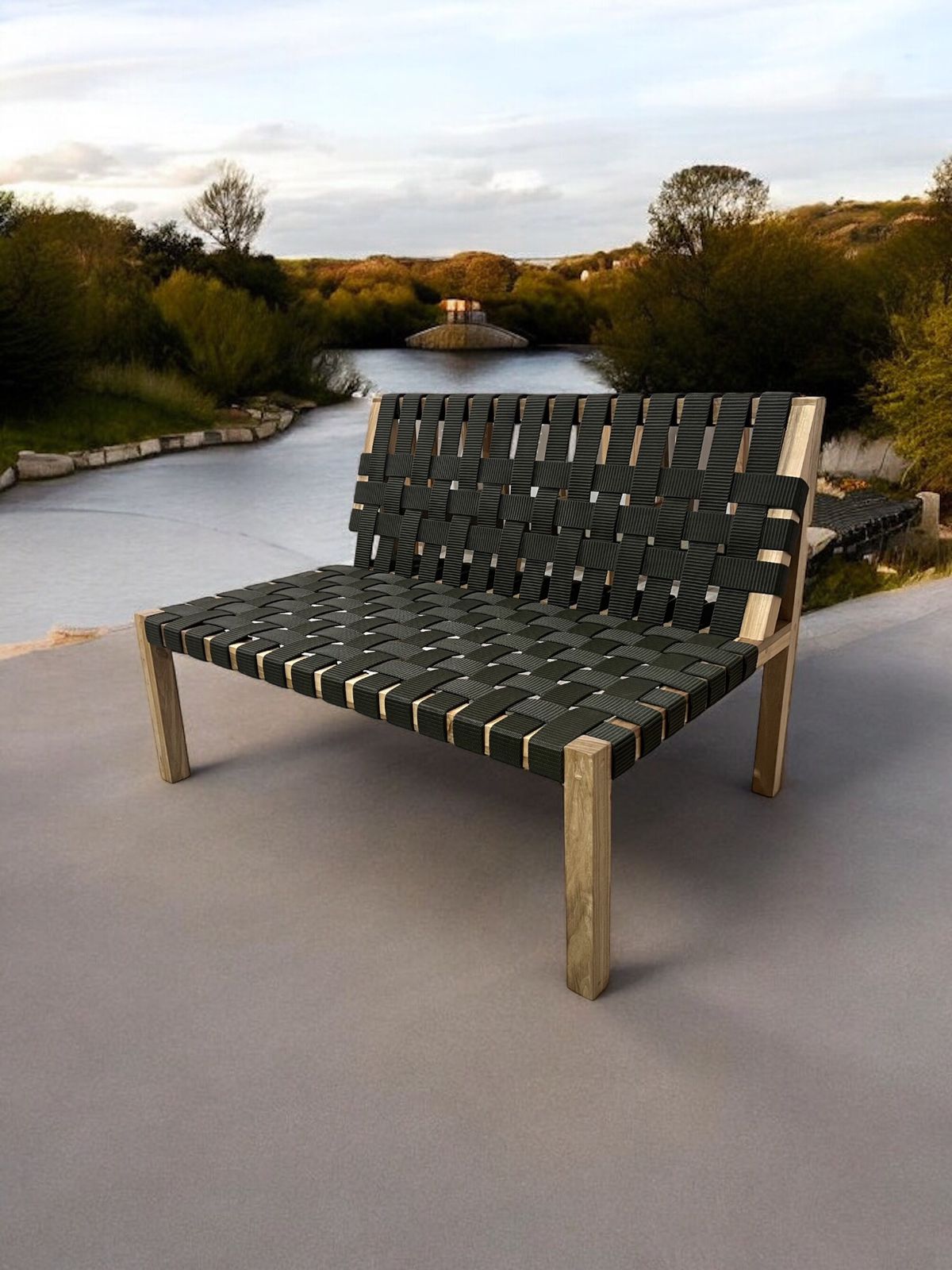 El asiento y respaldo están elaborados con un trenzado de cinchas de polipropileno, un material especialmente diseñado para resistir las inclemencias del tiempo, garantizando durabilidad y un look moderno