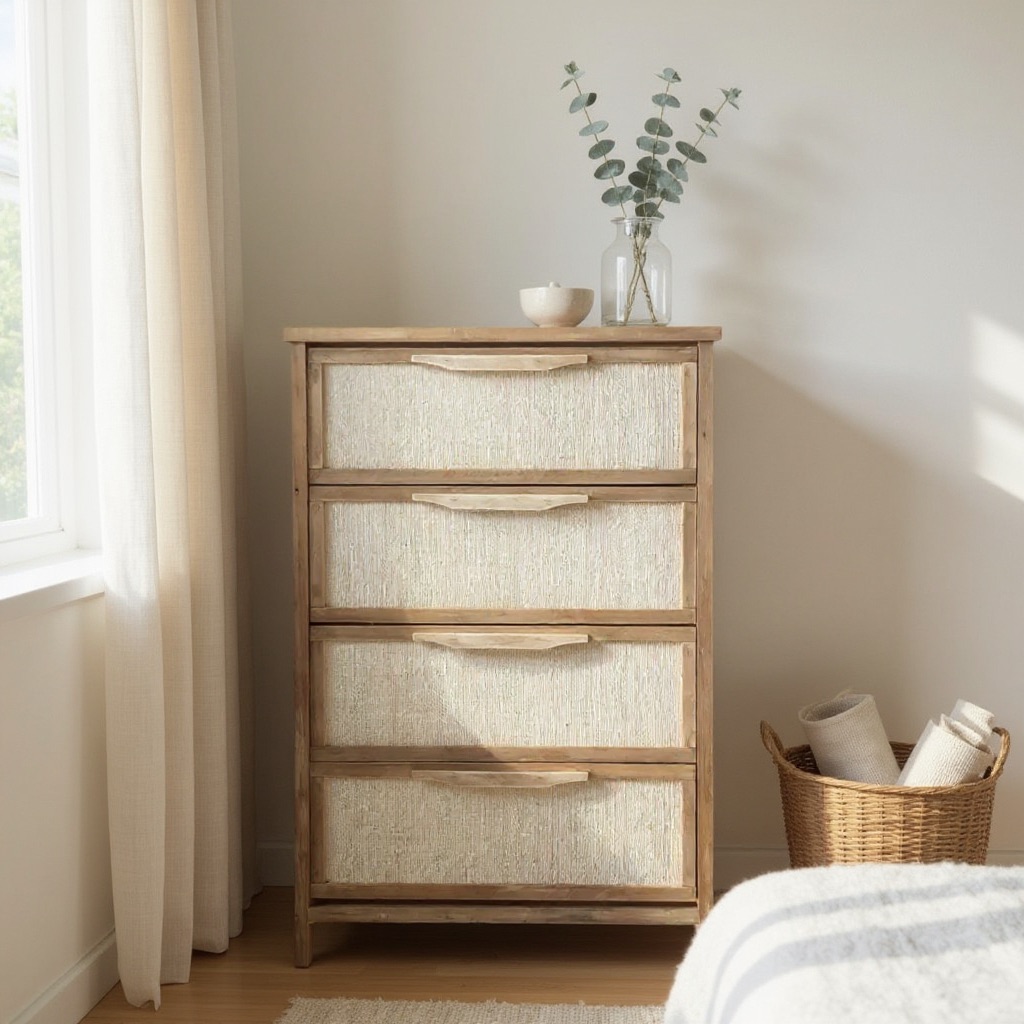Fabricada en madera maciza de álamo (1era) con tinta color petiribí y terminación en laca poliuretánica, esta cajonera alta refleja la armonía del estilo Japandi. Cuatro  cajones espaciosos con frente entelado en auténtica rafia agregando textura y sofisticación, guías telescópicas asegurando un deslizamiento suave y preciso.