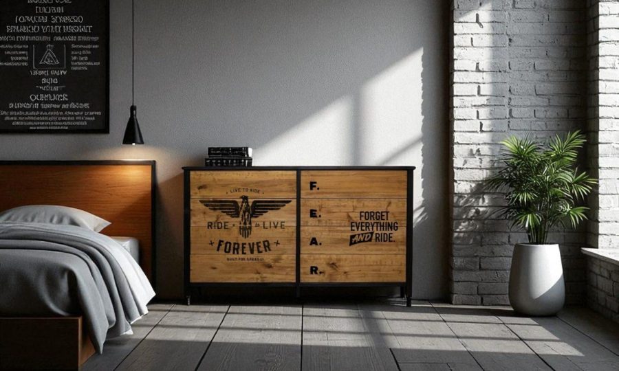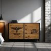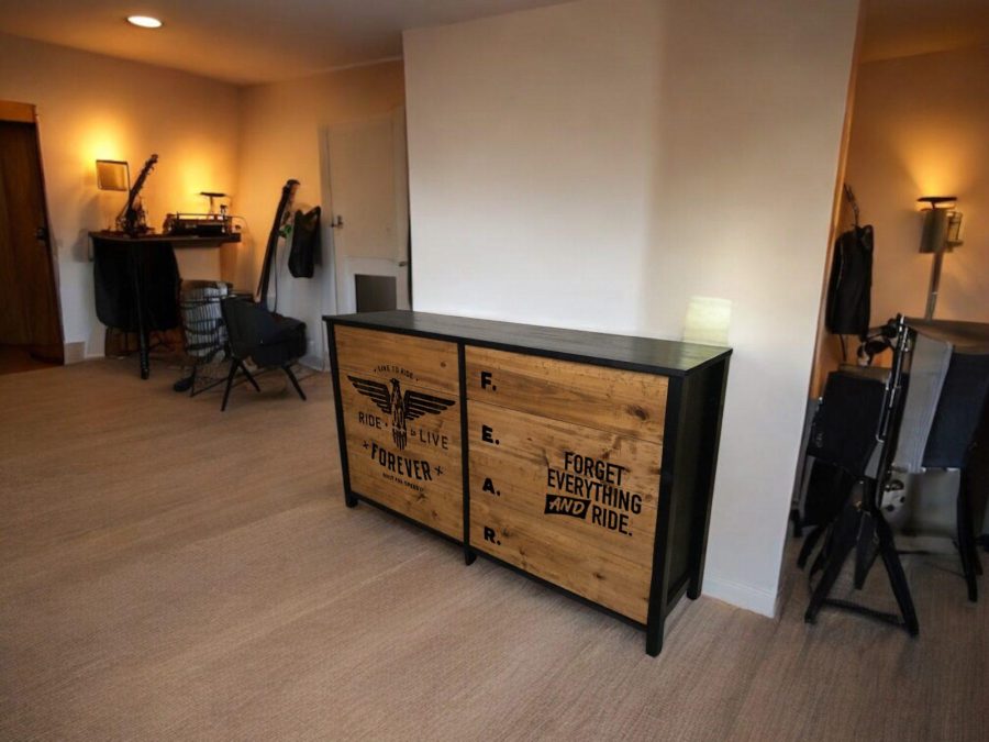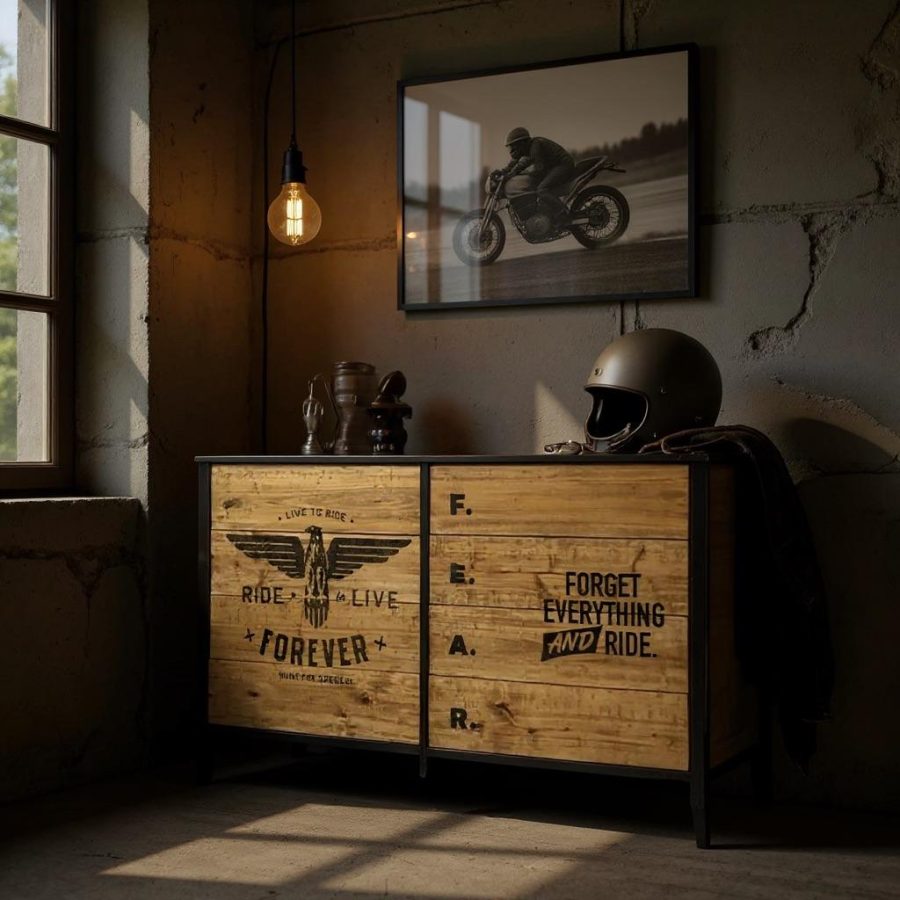 Fabricada en madera maciza de álamo (1era) con tinta color Negro y tapas de cajones rústicas con tinta Roble y terminación en laca poliuretánica con 8 grandes cajones. Un diseño rider estampado en perfecta combinación con