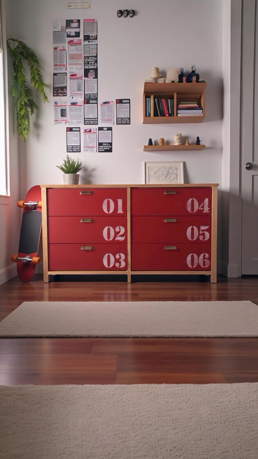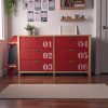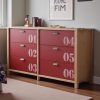Esta cómoda es de madera maciza de Álamo con tinta petiribi y cajones rojos, estampados con numeros.