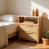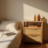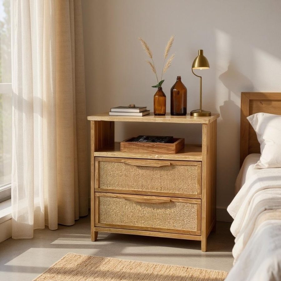 Fabricada en madera maciza de álamo Premium con tinta color petiribí y terminación en laca poliuretánica, esta mesa de luz refleja la armonía del estilo Japandi. Dos cajones espaciosos con frente entelado en auténtica rafia agregando textura y sofisticación, guías telescópicas asegurando un deslizamiento suave y preciso.
