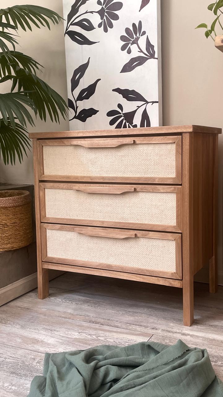 Sencillez, calidez y diseño en equilibrio. Fabricada en madera maciza de álamo con tinta color petiribí y terminación en laca poliuretánica, esta mesa de luz refleja la armonía del estilo Japandi. Su cajón espacioso con frente entelado en auténtica rafia agrega textura y sofisticación, mientras que la guía telescópica asegura un deslizamiento suave y preciso. Disponible en distintas configuraciones para adaptarse a cualquier ambiente.